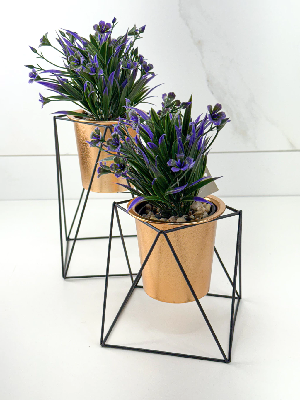 Decoração com brilho e estilo! Essa dupla de vasinhos em plástico rosé metalizado com suporte preto é perfeita para dar um toque contemporâneo e sofisticado à sua casa.