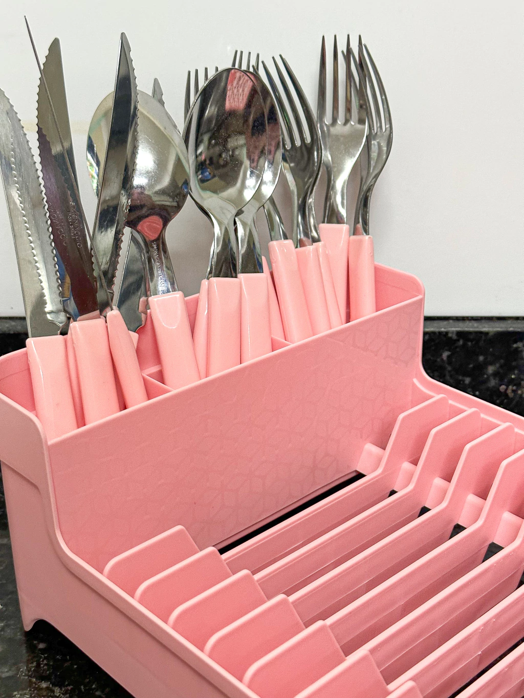 Este escorredor possui espaço para 9 pratos e 3 compartimentos para talheres, garantindo que sua louça fique organizada e seca rapidamente. Um detalhe especial? A parte com flores transparentes que brilha sob a luz, trazendo um toque de elegância para sua cozinha.
