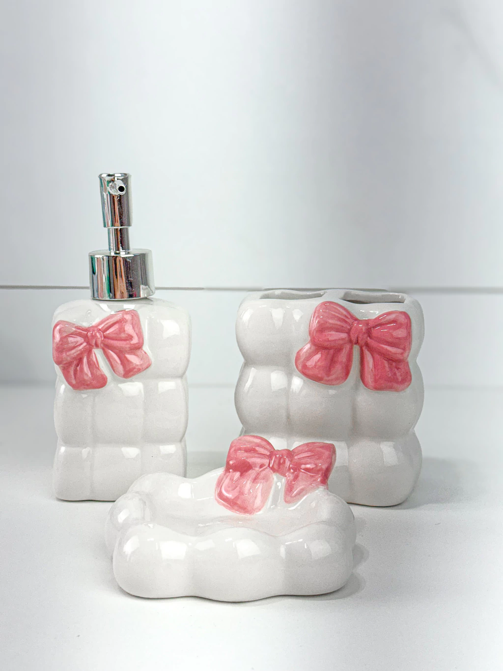 Transforme seu banheiro com o Kit para Banheiro Lacinho - 3 peças, que une praticidade e charme para deixar seu espaço ainda mais delicado e organizado.