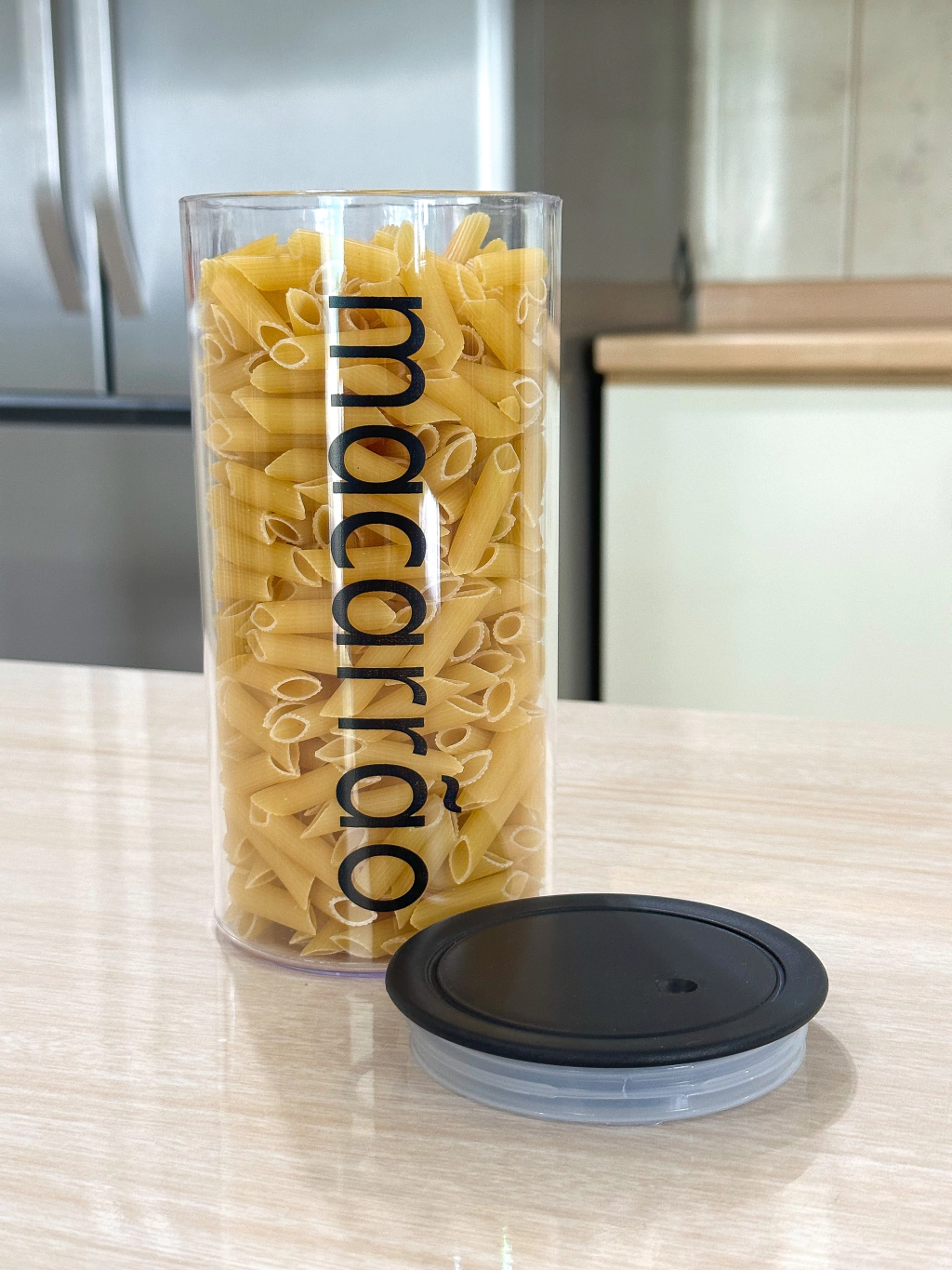 A tampa preta hérmetica não só garante a frescura do seu alimento, mas também traz um toque de charme à sua decoração. O pote conta com uma elegante escrita em preto, destacando-se como um verdadeiro ícone de organização na sua despensa.